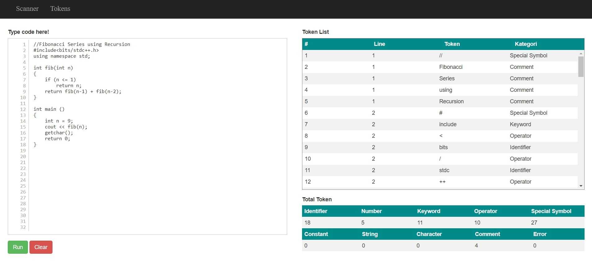 A lexical analyzer or scanner website application. The website read C++ source as an input, group it into tokens, and analyze the category or type of tokens.