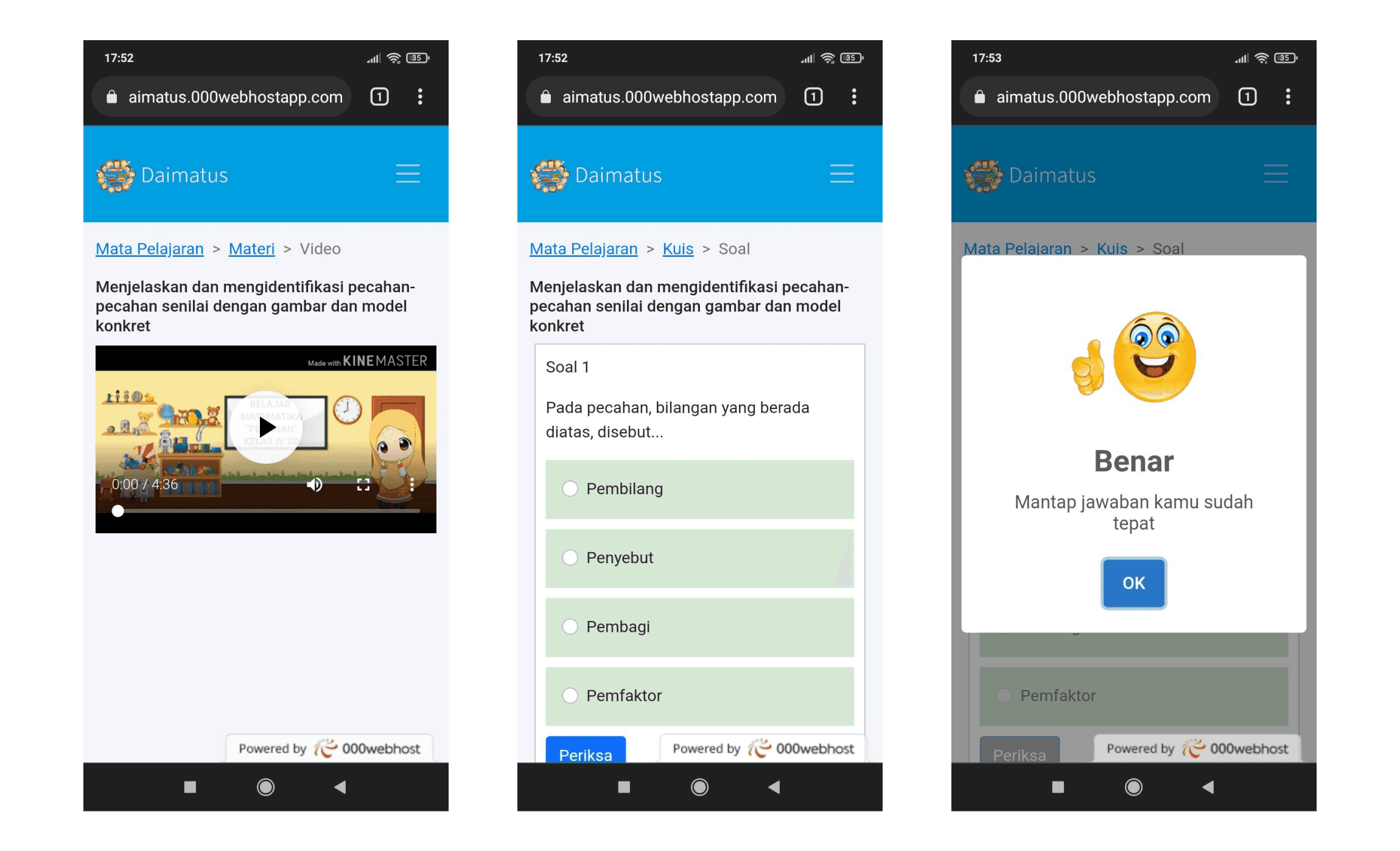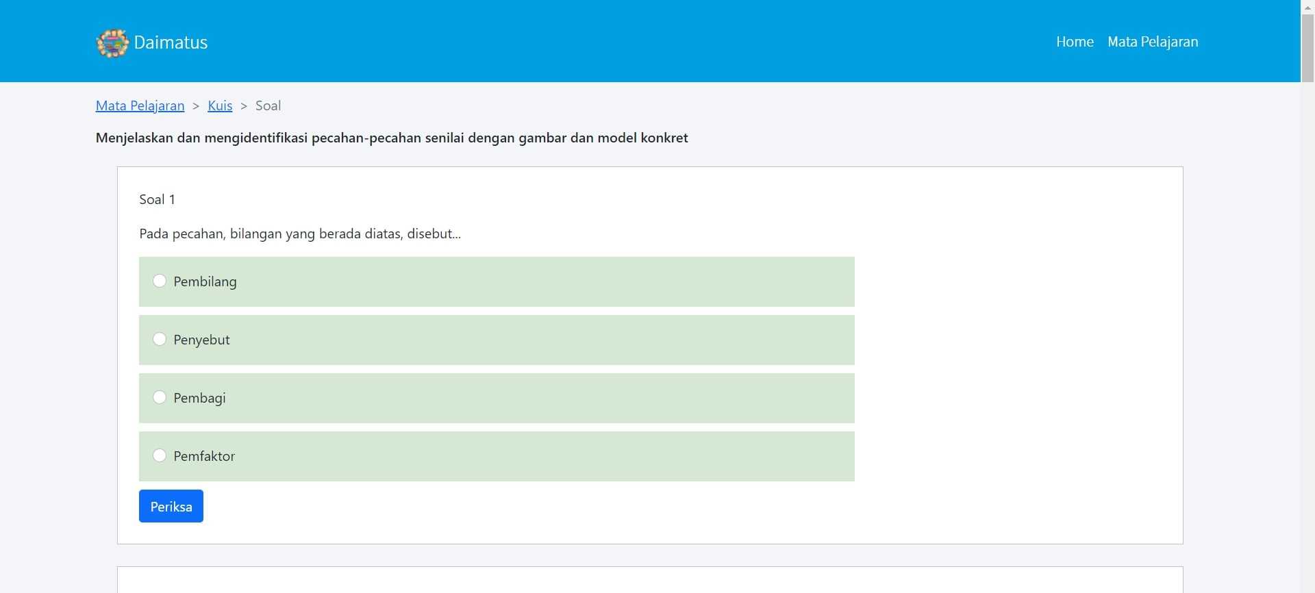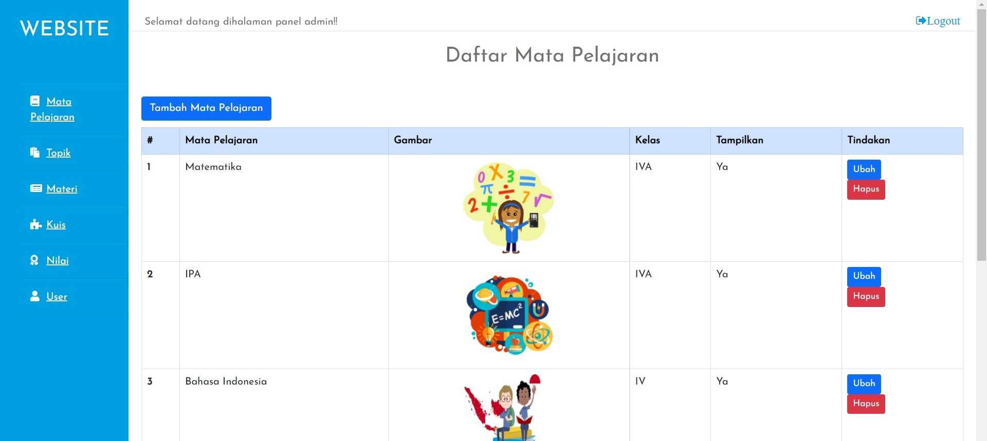 A full-stack web used as an online learning platform for fourth-grade students. This web has a client and admin site. The student can watch learning materials and do the quiz. The teacher used the admin site to upload, update, and delete learning materials and quizzes.