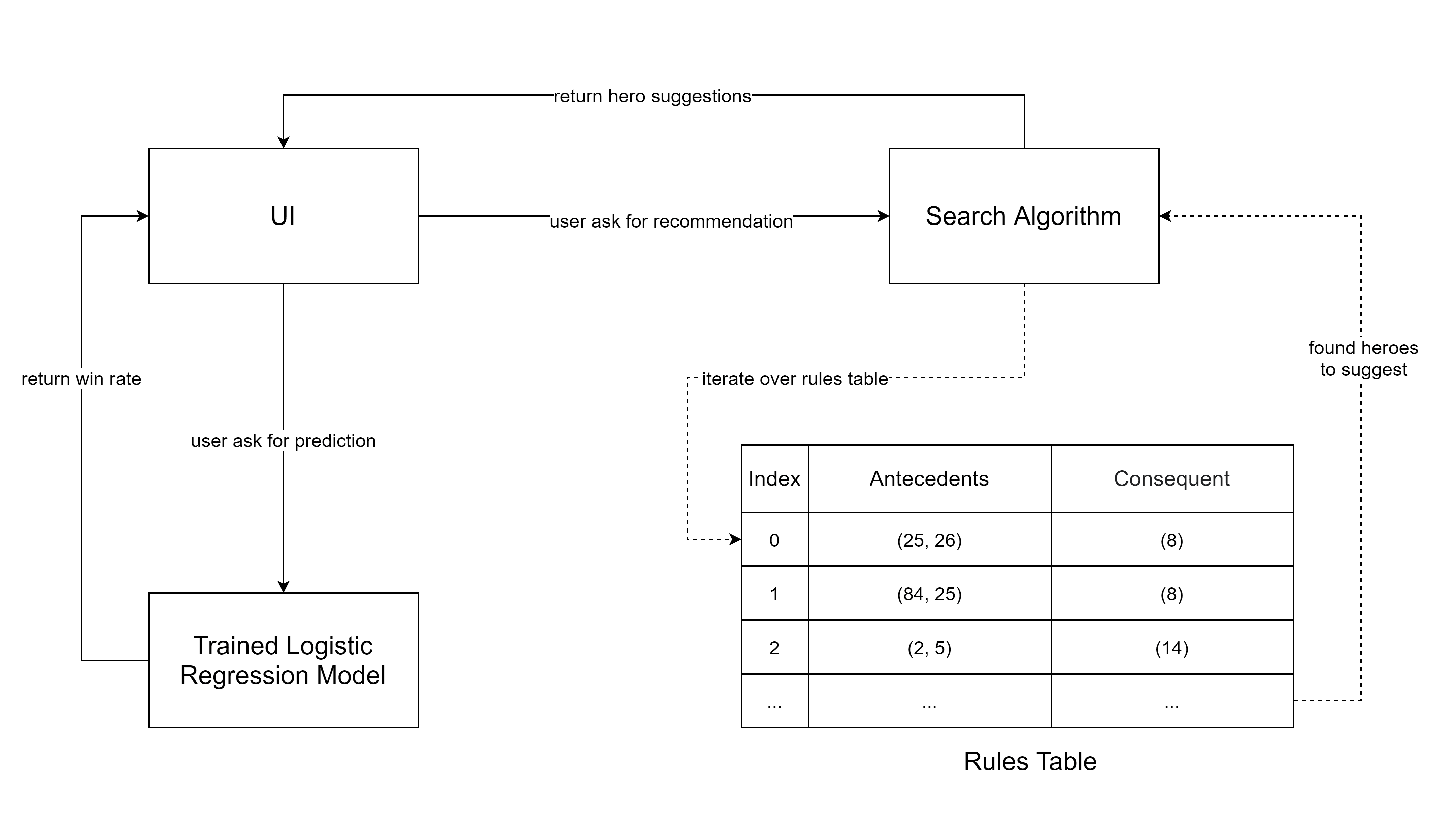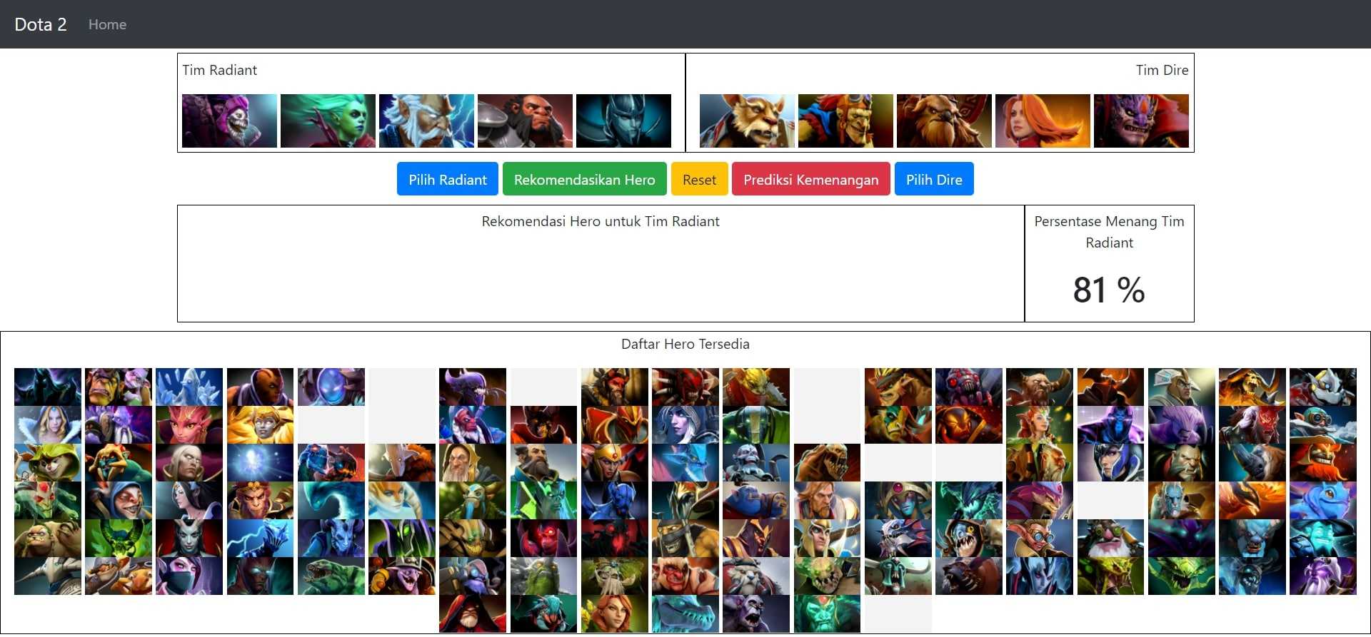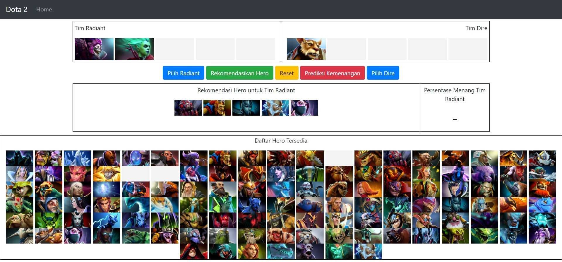 Web-based Dota 2 hero recommendation system and match prediction. The system provides hero suggestions from the combination of heroes that often win when they are picked together. The recommendation system is built based on Association Rules which mined from a dataset of 621,064 Dota 2 matches using the FP-Growth algorithm. I developed 3 machine learning models Multilayer Perceptron, Logistic Regressing, and XGBoost with a similar accuracy of 63%. For deployment, Logistic Regressing is used which has the lowest storage need for dependencies installation. The results of the recommendation system performance obtained a success rate of 81% from 1000 simulations.